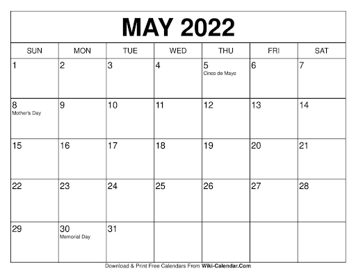 Source: https://blankcalendarpages.com/May-2022-calendar